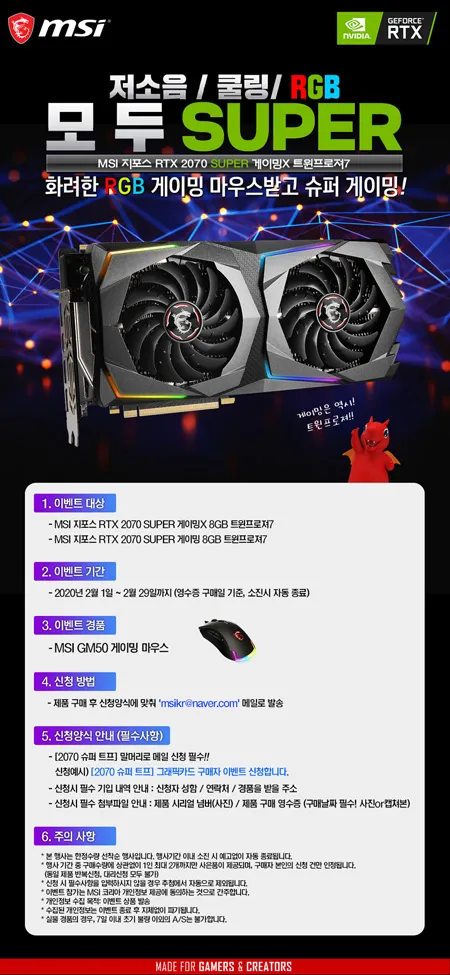 엠에스아이코리아는 ‘MSI 지포스 RTX 2070 SUPER 게이밍X 8GB 트윈프로져7’ 그래픽카드 구매자에게 RGB 게이밍 마우스 선물을 증정하는 이벤트를 진행한다.