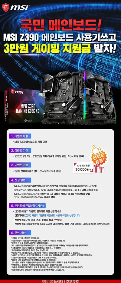 본 이벤트는 2월 1일(토)부터 2월 29일(토)까지 진행하며, MSI Z390 칩셋 메인보드 전 제품을 구매한 모든 구매자를 대상으로 한다. 이벤트 경품은 ‘3만원 게이밍 지원금(신세계상품권)’으로, 우수한 사용기를 작성한 고객을 대상으로 추첨 선착순 증정 예정이다.