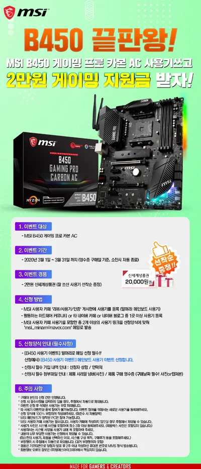 본 이벤트는 3월 1일(일)부터 3월 31일(화)까지 진행하며(단, 이벤트 기간 중 구매 고객 대상, 소진시 자동종료), ‘MSI B450 게이밍 프로 카본 AC’ 메인보드 제품을 구매한 모든 고객을 대상으로 한다. 이벤트 경품은 ‘2만원 게이밍 지원금(신세계상품권)’으로, 우수한 사용기를 작성한 유저를 대상으로 추첨 선착순 증정 예정이다.