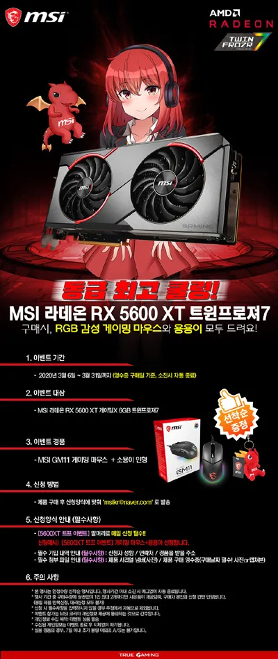 이번 행사는 2020년 3월 6일부터 2020년 3월 31일까지 ‘MSI 라데온 RX 5600 XT 게이밍X 6GB 트윈프로져7’ 그래픽카드를 구매하는 고객에게 RGB 감성의 MSI GM11 게이밍 마우스를 증정한다. 준비된 경품이 모두 소진 시 행사는 자동으로 종료된다.