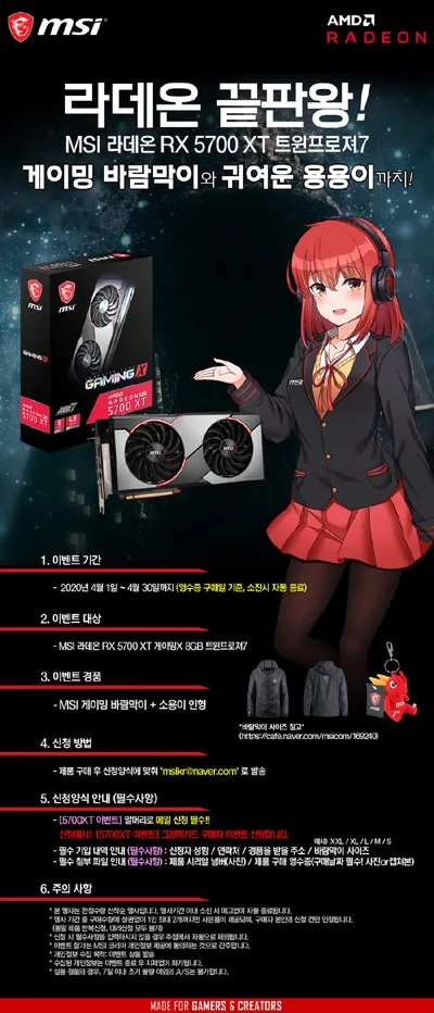 엠에스아이코리아는 ‘MSI 라데온 RX 5700 XT 게이밍X 8GB 트윈프로져7’ 그래픽카드 구매자에게 게이밍 바람막이와 용용이 등 다양한 경품을 증정하는 이벤트를 진행한다.