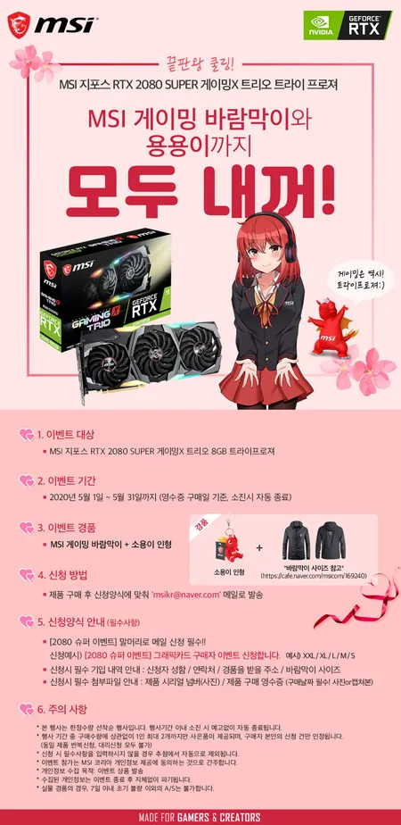 이번 행사는 2020년 5월 1일부터 5월 31일까지 ‘MSI 지포스 RTX 2080 SUPER 게이밍X 트리오 8GB 트라이프로져’를 구매하는 고객에게 사계절 모두 편하게 착용 가능한 ‘MSI 게이밍 바람막이’ 함께 ‘용용이 열쇠고리’ 증정한다. 준비된 경품이 모두 소진 시 행사는 자동으로 종료된다.