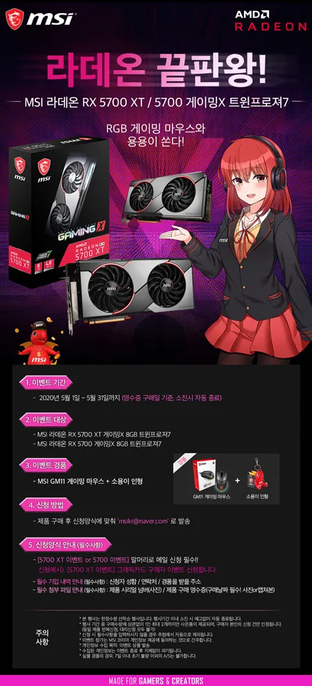 이번 행사는 5월 31일까지 ‘MSI 라데온 RX 5700 XT 게이밍X 8GB 트윈프로져7’, ‘MSI 라데온 RX 5700 게이밍X 8GB 트윈프로져7’ 구매자에게 RGB 감성의 GM11 게이밍 마우스와 ‘용용이 열쇠고리’를 증정한다. 준비된 경품이 모두 소진 시 행사는 자동으로 종료된다.