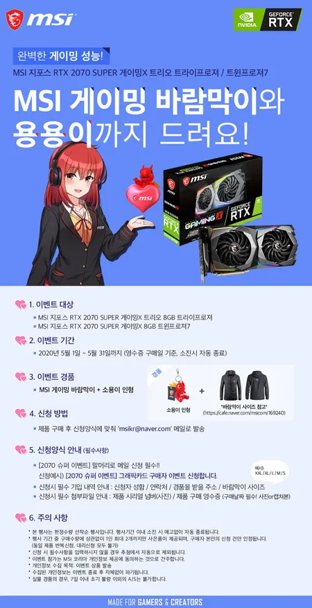 이번 행사는 2020년 5월 1일부터 5월 31일까지 ‘MSI 지포스 RTX 2070 SUPER 게이밍X 8GB 트윈프로져7’, ‘MSI 지포스 RTX 2070 SUPER 게이밍X 트리오 8GB 트라이프로져’를 구매하는 고객에게 사계절 모두 편하게 착용 가능한 ‘MSI 게이밍 바람막이’ 함께 ‘용용이 열쇠고리’ 증정한다. 준비된 경품이 모두 소진 시 행사는 자동으로 종료된다.