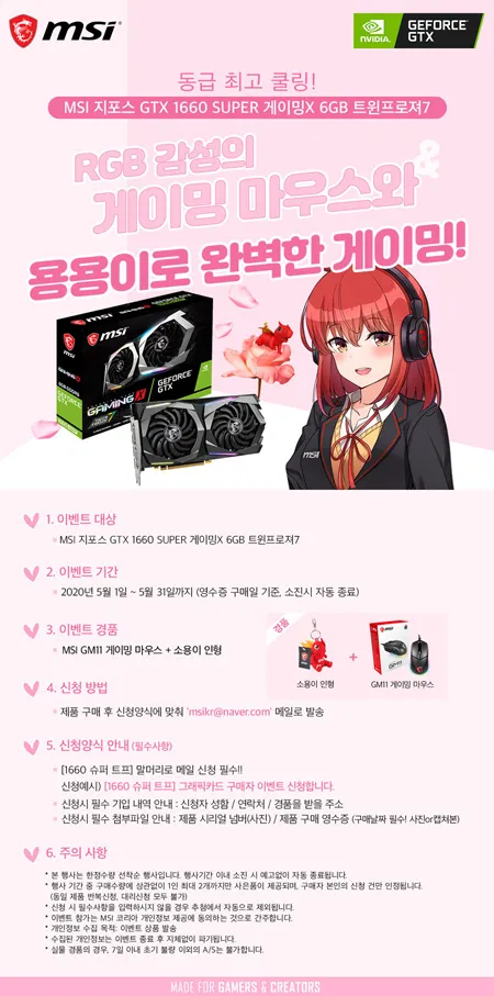 이번 행사는 2020년 5월 1일부터 5월 31일까지 ‘MSI 지포스 GTX 1660 SUPER 게이밍X 6GB 트윈프로져7’를 구매하는 고객에게 RGB 감성의 GM11 게이밍 마우스와 함께 ‘용용이 열쇠고리’ 증정한다. 준비된 경품이 모두 소진 시 행사는 자동으로 종료된다.
