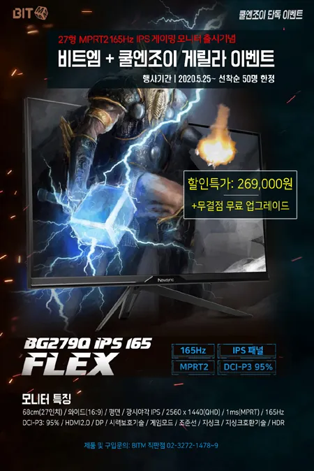 행사기간은 5월 25일부터 재고 소진시까지며 이 기간동안 Newsync BG279Q IPS 165 FLEX 는 특가 269,000원에 판매된다. 이벤트 수량은 50대 한정이며, 구매자 모두에게 무결점으로 업그레이드해서 발송한다. 배송비는 무료이며, 포토상품평을 작성하는 고객 전원에게 네이버포인트 3,000원을 100% 증정한다.