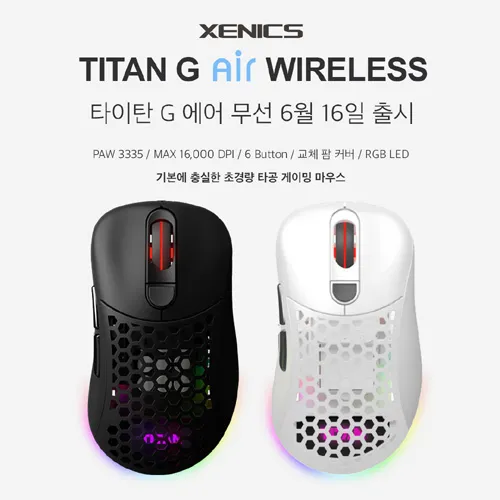 타이탄 G 에어 Wireless 무선 게이밍 마우스는 블랙과 화이트 두 모델이 오는 6월 16일에 출시될 예정이며 동시에 출시 특가 및 후기 이벤트를 함께 실시할 예정이다.