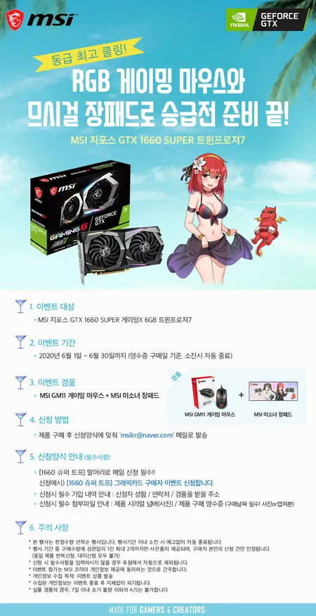 이번 행사는 2020년 6월 1일부터 6월 30일까지 ‘MSI 지포스 GTX 1660 SUPER 게이밍X 6GB 트윈프로져7’를 구매하는 고객에게 RGB 감성의 ‘GM11 게이밍 마우스’와 함께 ‘MSI 미소녀 장패드’를 증정한다. 준비된 경품이 모두 소진 시 행사는 자동으로 종료된다.