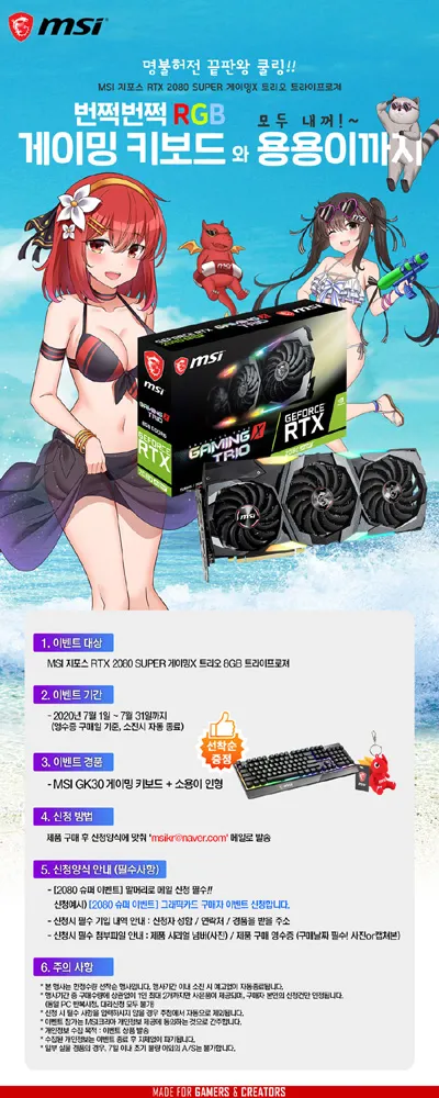 이번 행사는 2020년 7월 1일부터 7월 31일까지 ‘MSI 지포스 RTX 2080 SUPER 게이밍X 트리오 8GB 트라이프로져’를 구매하는 고객에게 화려한 RGB와 함께 다양한 기능이 포함된 ‘MSI GK30 게이밍 키보드’와 함께 MSI 마스코트 ‘용용이’를 증정한다. 준비된 경품이 모두 소진 시 행사는 자동으로 종료된다.