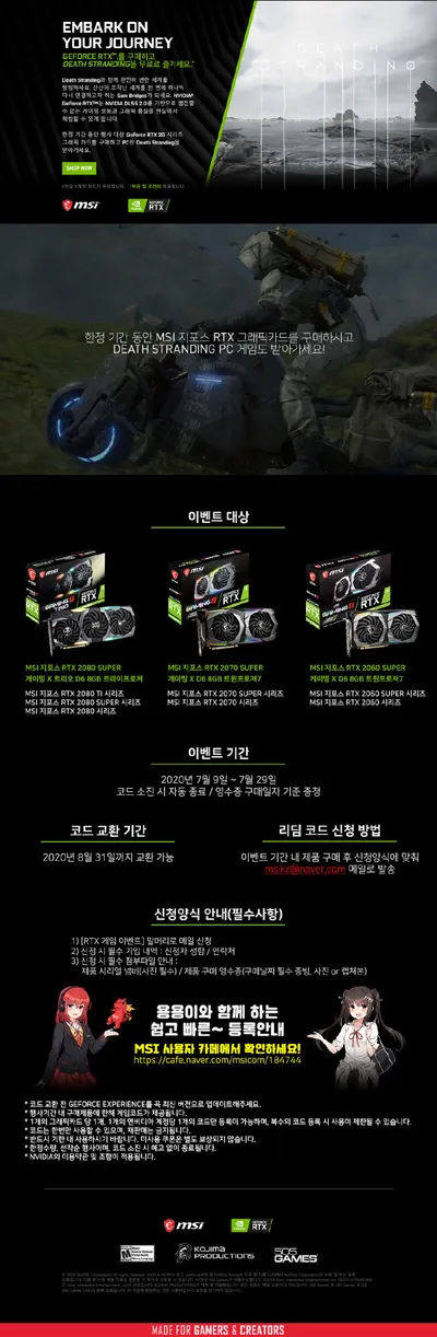 엠에스아이코리아는 ‘MSI 지포스 RTX 20 SUPER 시리즈 / RTX 20 시리즈’ 그래픽카드 구매자들에게 최신 인기 게임 ‘데스 스트랜딩’을 증정하는 행사를 진행한다.