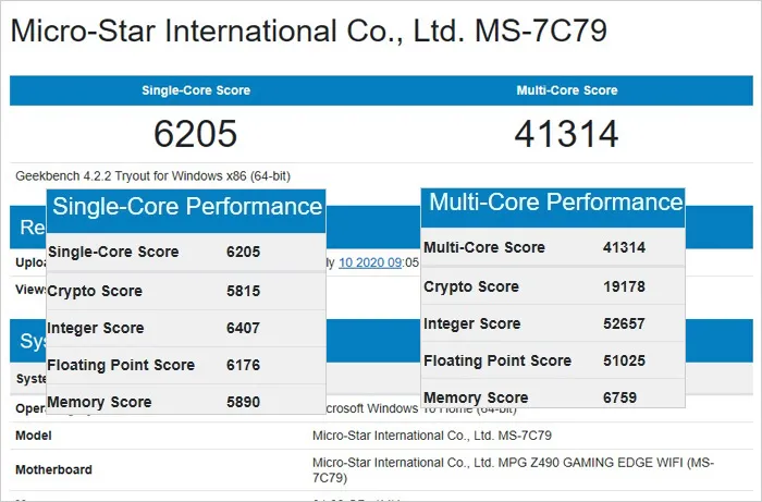 쉽게 CPU 성능을 확인할 수 있도록 대중적인 벤치 프로그램인 CPU-Z 와 긱벤치4를 이용해 성능을 확인해본 모습으로 하위 모델인 i7-10700K 나 기존의 하이엔드급 모델인 i9-9900K와 비교되는 높은 스코어를 보여주었다.
