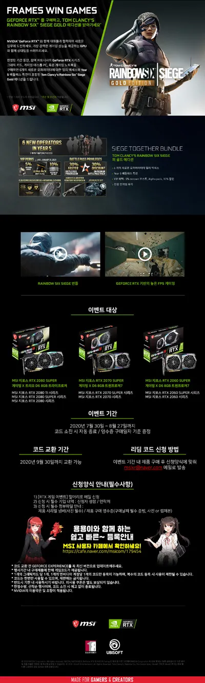 엠에스아이코리아는 ‘MSI 지포스 RTX 20 SUPER 시리즈 / RTX 20 시리즈’ 그래픽카드 구매자들에게 인기 FPS 게임 ‘레인보우 식스’를 증정하는 행사를 진행한다.