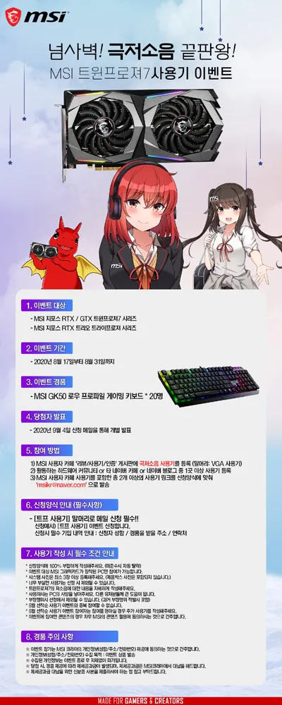 경품은 RGB와 로우 프로파일 기계식 스위치를 탑재한 ‘MSI GK50 로우 프로파일 게이밍 키보드’ 로 정확하고 빠른 반응속도를 자랑하는 스위치와 안티 고스팅 등 다양한 게이밍 기능이 탑재된 고성능 게이밍 키보드이며, ‘MSI 지포스 RTX / GTX 트윈프로져7 시리즈’와 ‘MSI 지포스 RTX 트리오 트라이프로져 시리즈’ 그래픽카드를 사용하는 모든 사용자들은 2개 이상의 사용기 작성 후 신청양식에 맞게 메일 발송 시 이벤트에 응모가 가능하다.