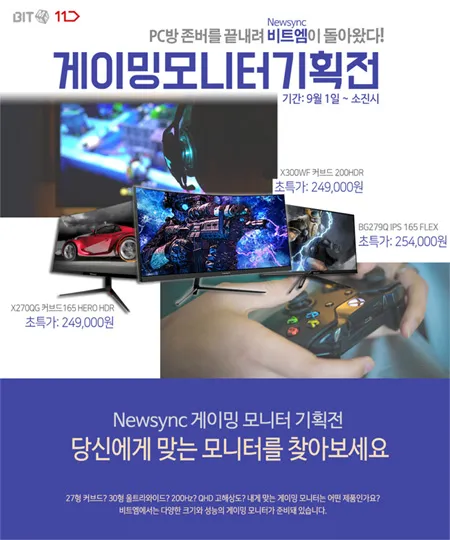 비트엠은 11번가 9월 게이밍 모니터 브랜드 기획전을 열고 자사의 인기 Newsync 게이밍 모니터 16종을 대상으로 이벤트를 실시한다.