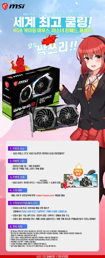엠에스아이코리아는 ‘MSI 지포스 GTX 1660 SUPER 게이밍X 트윈프로져7’ 그래픽카드 구매자에게 RGB 게이밍 마우스, MSI 미소녀 장패드, 용용이 인형 등 경품을 증정하는 이벤트를 진행한다.