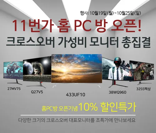 크로스오버는 24형부터 43형 까지 다양한 크기의 게이밍 모니터들을 대상으로 홈PC방 오픈 특가전을 펼친다.