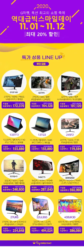 크로스오버는 인기 모니터 30종을 대상으로 옥션 지마켓 빅스마일데이 기획전을 진행한다. 이번 행사동안 크로스오버의 포터블, 24, 27, 32, 34, 38, 43형 등 다양한 모니터들이 저렴하게 판매된다.