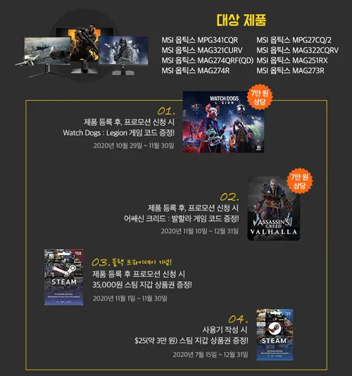 각각의 이벤트에 따라 2020년 11월 30일까지 또는 12월 31일까지 진행되는 이번 프로모션에서는 행사 대상 MSI 게이밍 모니터 및 PC구매 시 최신 게임 ‘와치 독스 : 리전’과 ‘어쌔신 크리드 : 발할라’ 게임코드를 제공, 구매 제품에 따라 최대 10만 원 스팀 지갑 상품권을 증정하며 사용기 작성 시 3만 원 상당의 스팀 지갑 상품권을 추가로 증정한다.