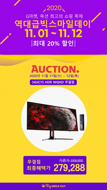 이번 옥션 빅스마일데이를 통해 34UC75 모니터는 이벤트 가격인 279,288원에 판매되며, 무결점 모델로 발송된다. 이때 스마일클럽 20% 할인쿠폰을 적용해야만 특가로 구입 가능하다. 행사는 11월 11~12일 까지 양일간 진행되며, 준비된 수량 100대가 모두 소진되면 행사가 자동 종료된다. 구매자의 부담을 덜기 위해 배송비는 무료로 진행된다.