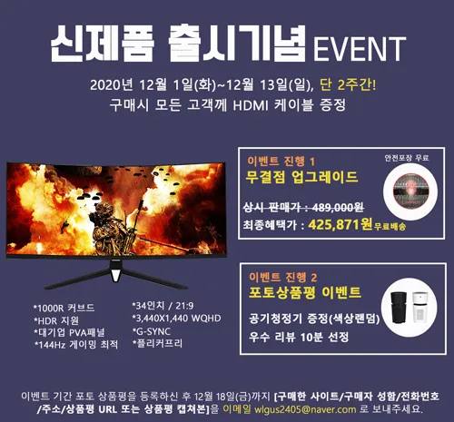 먼저 12월 1일(화)~ 13일(일) 까지 진행되는 이번 행사에서 34WQ850 게이밍 모니터는 상시가 489,000원에서 10%할인된 최종혜택가 425,871원에 판매된다. 이때 반드시 10% 다운로드 쿠폰을 내려받아 적용해야만 최종혜택가로 구입할 수 있다. 행사는 선착순 100대 한정으로 진행되며, 구입시 무결점 모델로 무료 업그레이드 해서 발송된다. 포토상품평 작성시 추첨을 통해 차량용 공기청정기를 10명에게 증정하며, 고객의 부담을 덜기 위해 배송비는 무료다. 이번 34WQ850 이벤트 상품 구입자 전원에게 HDMI 케이블 또한 추가로 증정한다.