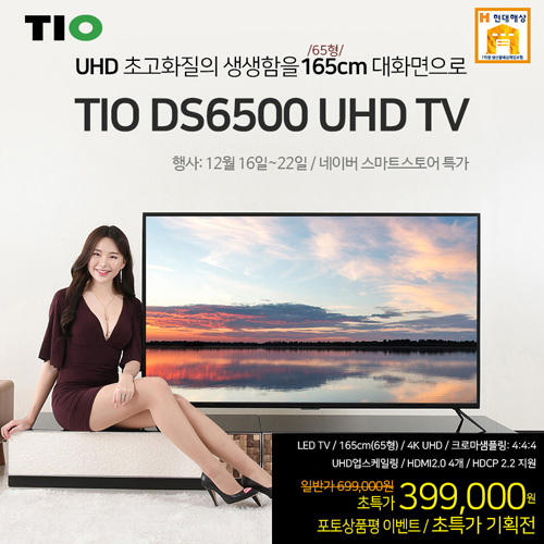 크로스오버존이 65형 대화면 UHD TV인 TIO DS6500 UHD TV를 대상으로 특가전을 진행한다. 12월16일(수)~ 22일(화) 동안 네이버 스마트스토어에서 TIO DS6500 UHD TV는 특별한 가격인 399,000원에 판매된다. 행사는 선착순 100대 한정으로 진행되며, 포토상품평 작성시 신세계 상품권 5,000원도 지급한다. 인스타그램 리뷰 이벤트 참여시 역시 5,000원 상품권을 제공하며, 포토상품평과 인스타그램 상품평은 중복 참여 가능하다.