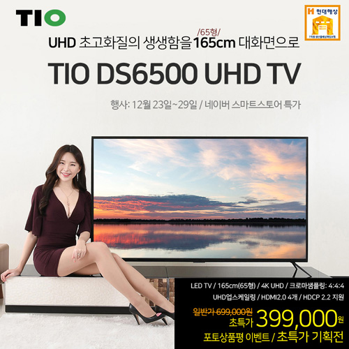 크로스오버존이 65형 대화면 UHD TV인 TIO DS6500 UHD TV를 대상으로 특가전을 진행한다. 12월23일(수)~ 29일(화) 동안 네이버 스마트스토어에서 TIO DS6500 UHD TV는 특별한 가격인 399,000원에 판매된다. 행사는 선착순 100대 한정으로 진행되며, 포토상품평 작성시 신세계 상품권 5,000원도 지급한다. 인스타그램 리뷰 이벤트 참여시 역시 5,000원 상품권을 제공하며, 포토상품평과 인스타그램 상품평은 중복 참여 가능하다.
