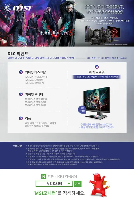 2020년 1월 31일까지 행사 대상 MSI 게이밍 모니터 및 게이밍 PC를 구매하고, 프로모션에 참여하는 구매자 에게 ‘데빌 메이 크라이 5 디럭스 에디션’ 게임 코드를 제공한다. 특히, 이 코드는 신규 캐릭터 ‘버질’을 플레이 할 수 있는 DLC까지 모두 포함, 약 64,000원 상당의 가치를 갖는다.