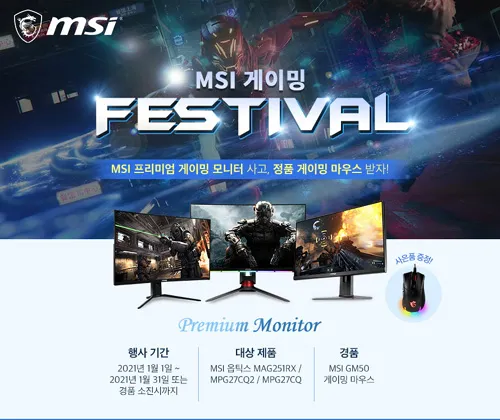 한국 게이밍 모니터 시장의 성원에 보답하기 위해, MSI는 2021년 1월 31일까지 ‘MSI 옵틱스 MAG251RX’, ‘MSI 옵틱스 MPG27CQ2’, ‘MSI 옵틱스 MPG27CQ’를 구매하고 이벤트에 참여한 구매자 전원에게 4만 원 상당의 ‘MSI GM50’ 게이밍 마우스를 증정한다.