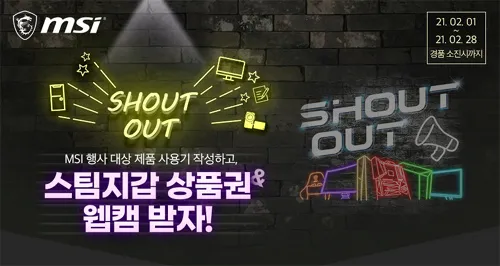 MSI는 MSI 게이밍 PC와 모니터 등 제품 구매 고객 중 사용기를 작성한 고객에게 2만 원 스팀 지갑 상품권 및 MSI FHD 프로캠을 증정하는 2021 SHOUT-OUT(이하 샤우트-아웃) 프로모션을 2월 28일까지 진행한다.
