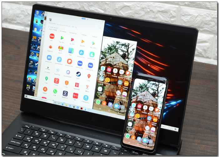 사용자 휴대폰 앱을 이용하면 사진과 같이 스마트폰을 노트북에서 컨트롤 할 수 있다. 스마트폰 화면 미러링은 물론 저장된 메시지만 사진 등을 확인할 수 있으며 통화 기능도 제공한다. 상단의 사진은 테스트를 진행하고 있는 모습으로 원할하게 작동하는 것을 확인할 수 있었다.