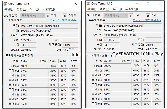 CPU 온도 테스트를 진행하고 있는 모습으로 (실내온도 17도) 아무것도 하지 않는 Idle 상태에서는 36도 정도로 작동했으며 10분간 오버워치를 플레이 했을 때에는 80도 이상까지 올라가는 것을 확인할 수 있었다. (기존 MSI 게이밍 노트북과 같이 장시간 게임시에도 성능저하 현상은 발생하지 않았다.)