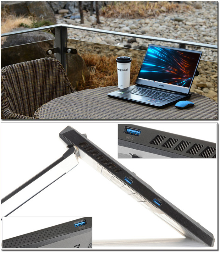 일반 노트북과 달리 주요 단자를 후면에 배치해 케이블로 인한 스트레스 없이 책상에서 노트북을 사용할 수 있다. 상단의 사진은 후면부의 모습으로 양 측면에 통풍구가 설치되어 있고 중앙에는 C타입의 USB 3.2 Gen2 단자를 비롯해 이더넷 단자와 외부 디스플레이 연결을 위한 HDMI 단자 (4K@60Hz 지원), 전원 단자가 설치된 것을 확인할 수 있다.