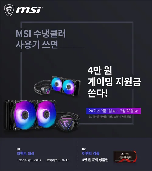 본 이벤트는 2월 1일(월)부터 2월 28일(일)까지 진행하며(단, 이벤트 기간 중 구매 고객 대상, 소진시 자동종료), MSI 수냉쿨러 모델 전 제품을 구매한 모든 고객을 대상으로 한다. 이벤트 경품은 ‘4만원 게이밍 지원금(문화상품권)’으로, 우수한 사용기를 작성한 고객을 대상으로 선착순 증정 예정이다.