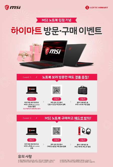 구매자 이벤트 참여방법은 하이마트 매장에서 MSI 노트북 구매 후, 이벤트 페이지의 QR코드에 접속한 뒤 구매 영수증 이미지와 개인정보를 등록하면 된다. 구매자 이벤트 참여자에게는 MSI 게이밍 헤드셋이 발송된다. 모든 이벤트는 선착순 경품 소진 시 예고 없이 종료된다.