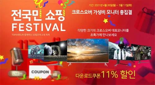 이번 행사동안 크로스오버의 27, 32,34, 38, 43형, 고해상도, 고Hz, 평면, 커브드, 게이밍 등 다양한 모니터들이 저렴하게판매된다. 11번가 쇼핑페스티벌 프로모션 상품들은 컨텐츠내에 ‘전국민 쇼핑 FESTIVAL’ 배너가 위치하며, 이를 클릭하면 11% PC주변기기할인쿠폰을 내려받아 사용할 수 있다. 행사기간은 4월 26일 월요일부터 5월 11일화요일까지 펼쳐진다.