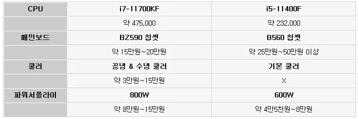 상단의 표를 대충만 봐도 알 수 있을 정도로 큰 가격차를 보이고 있다. 가성비에 특화된 게이밍 데스크탑이나 크리에이터용 PC를 조립하고 싶을 경우 i5 프로세서 기반으로 하는 것이 현명하다 할 수 있다.