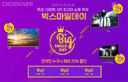 이번 행사동안 크로스오버의 포터블, 27, 32,34, 38, 43형 등 다양한 모니터들이 저렴하게 판매된다. 빅세일 상품들은 대표 이미지에 빅스마일 스티커가 붙게되며, 이 경우 스마일클럽 회원은 최대 20% 할인쿠폰을 받아 사용할 수 있다. 행사기간은 5월 10일 월요일부터 18일 화요일까지 다양하게 펼쳐진다.