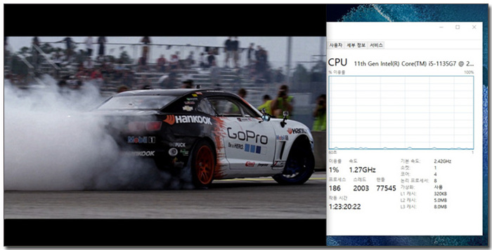 4K 동영상을 이용해 CPU 이용율을 테스트 하고 있는 모습으로 1~3%대의 안정적인 모습을 보여 주었다. 웹서핑과의 멀티테스킹시 50%대 중반까지 점유율이 올라가지만 영상과 웹사이트 모두 끊어짐은 발생하지 않았다.