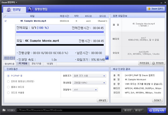 다음 팟인코더를 이용해 4K 동영상의 인코딩을 진행하고 있는 모습으로 4분 45초가 소요되는 것을 확인할 수 있었다.