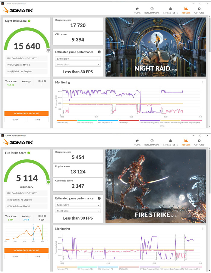 3DMARK를 이용해 3D 성능을 확인하고 있는 아이리스 Xe 내장 그래픽과 비슷한 그래픽 스코어를 보여주었다. (단, 실제 게임 성능은 확연히 다르다.) 캐주얼 온라인 게임은 성능걱정 없이 실행할 수 있다.