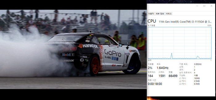 4K 동영상을 이용해 CPU 점유율 테스트를 진행하고 있는 모습으로 2-5% 의 안정적인 점유율을 보여 주었다. 또한 웹서핑과의 멀티테스킹 시에는 순간적으로 70% 이상까지 점유율이 올라갔지만 영상을 즐기는데 문제는 없었다.