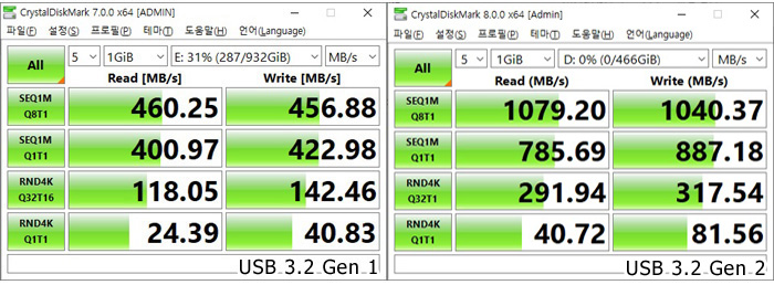 이 제품은 3개의 USB 3.2 Gen2 단자를 지원해 빠른 데이터 전송이 가능하다. 상단의 사진은 외장 SSD를 이용해 테스트를 진행하고 있는 모습으로 Gen1 과는 확연한 차이를 보여주었다. @ 제조사 스펙에 USB 3.0 과 USB C타입 으로 표시되어 3개단자의 속도 테스트를 진행했는데 3개 모두 1000MB/s을 넘어가는 빠른 속도를 보여주었다.