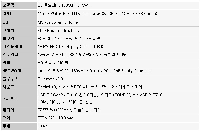 이번에 리뷰를 진행 할 LG 울트라PC 15U50P-GR3WK는 LG 노트북 공신 판매점인 대원CTS에서 판매하는 최신 노트북으로 인강이나 재택근무에 딱 어울리는 스펙으로 구성되어 있다. 11세대 인텔코어 i3-1115G4 프로세서와 8GB 의 DDR4 메모리, 128GB NVMe SSD 탑재로 높은 성능을 경험할 수 있으며 1.8Kg 에 불과한 가벼운 무게로 집이나 사무실 뿐만 아니라 다양한 장소에서 사용할 수 있다.