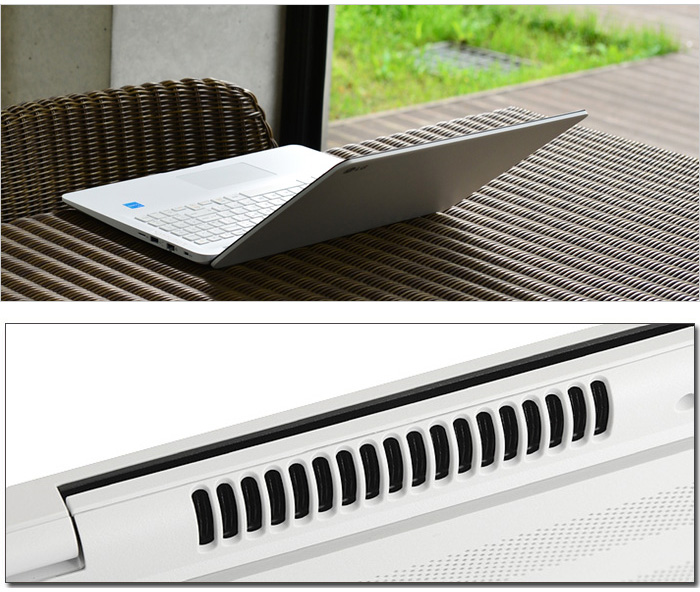 기기의 디자인은 화이트 컬러를 적용해 깔끔하고 화사한 느낌을 주며 마감 완성도가 상당히 뛰어나 고급스러운 느낌을 자아낸다. 특히 다른 노트북과 달리 지문이 잘 묻어나지 않으며 촉감이 상당히 뛰어난 것을 확인할 수 있었다.