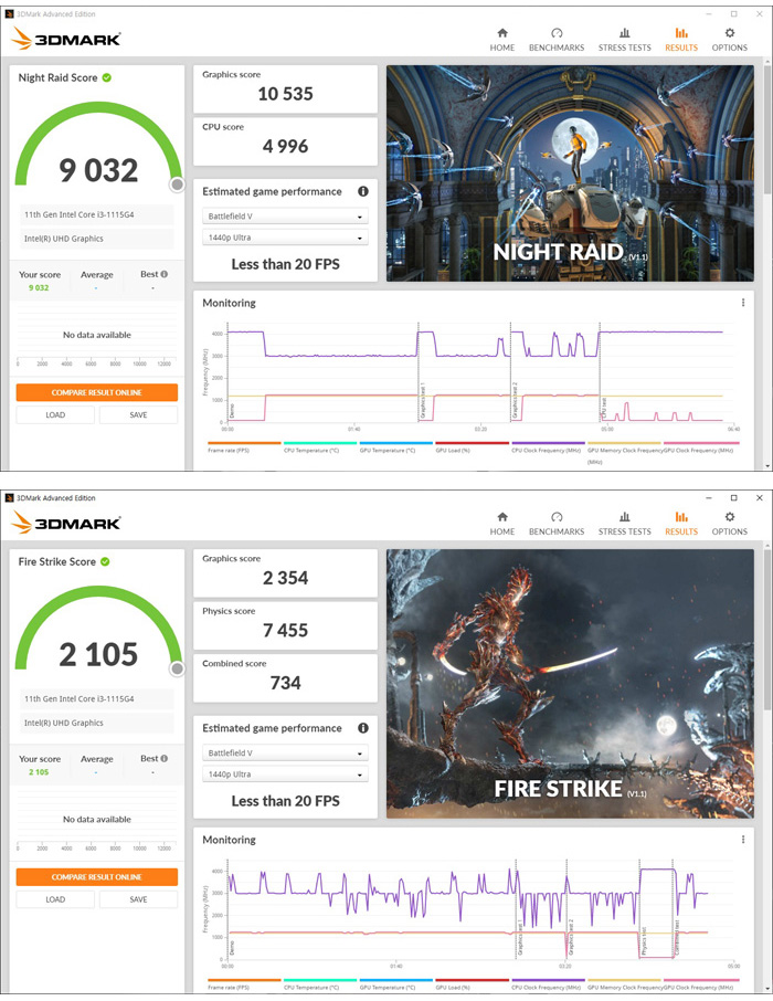 3DMARK를 이용해 3D 성능을 확인하고 있는 모습으로 인텔 UHD 그래픽을 사용하는 기존 제품들과 분명한 성능차이를 보여주었다. (11세대 인텔코어의 경우 프로세서 성능 뿐만 아니라 내장그래픽 성능도 향상 되었다.)