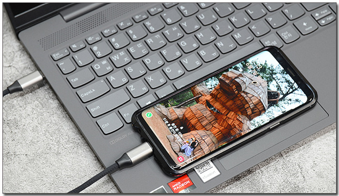 C타입 단자와 배터리 아이콘이 그려진 A타입 단자는 상시전원을 지원해 노트북이 꺼진 상태에서도 스마트폰 충전이 가능하다. (레노버 Vantage에서 USB 상시전원 설정을 해야한다.) 상단의 사진은 충전 테스트를 진행하고 있는 모습으로 원할하게 스마트폰이 충전되는 것을 확인할 수 있었다. 회사나 집에서 굳이 충전기를 찾아다닐 필요가 없을 것이다.