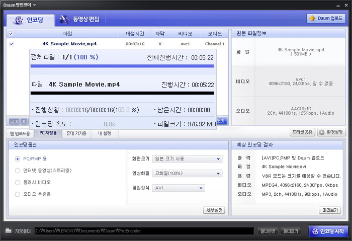 다음 팟인코더를 이용해 4K 동영상의 인코딩을 진행하고 있는 모습으로 5분 22초가 소요되는 것을 확인할 수 있었다.