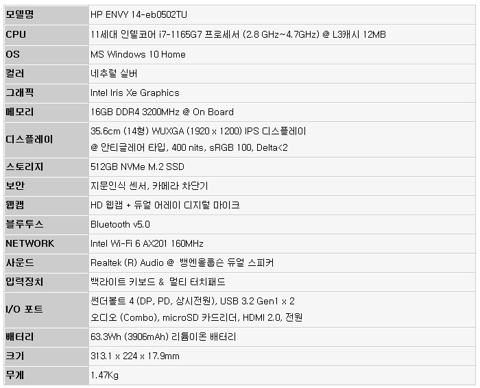 이번에 리뷰를 진행 할 HP ENVY 14-eb0502TU 은 가볍게 휴대하며 디자인 등의 전문작업 용도로 활용할 수 있는 노트북으로 보급형 노트북과는 확연히 다른 스펙을 보여주고 있다. 11세대 인텔코어 i7-1165G7 프로세서를 비롯해 16GB DDR4 메모리와 512GB NVMe SSD 탑재로 높은 성능을 구현하지만 무게는 1.47Kg 에 불과해 쉽게 휴대하며 사용할 수 있다.