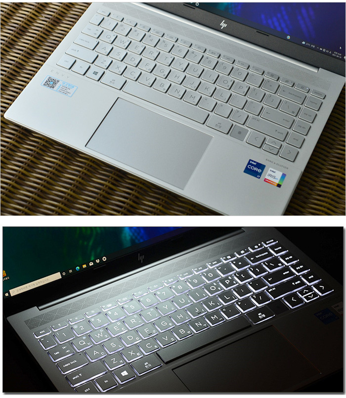 키보드의 모습으로 휴대성에 특화된 14형 모델답게 텐키리스 방식의 치클릿 키보드가 장착된 것을 확인할 수 있다. 특히 고급형 모델답게 밝기 조절이 가능한 LED 백라이트 지원으로 야간에도 불편없이 노트북을 사용할 수 있다.