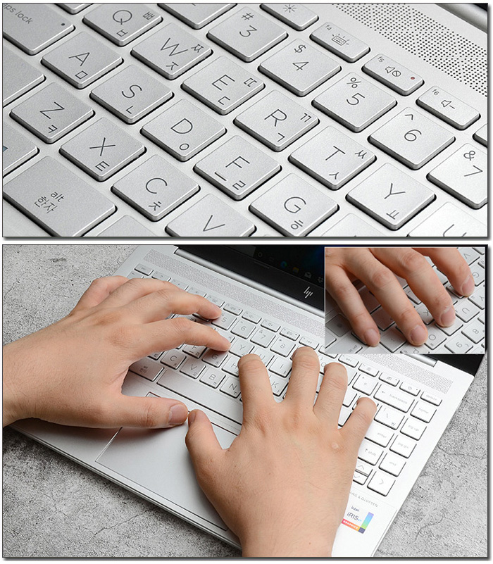 노트북 상단에는 신선한 공기가 유입되는 통풍구가 설치되어 있고 다양한 펑션키를 지원해 편의성을 높였다. (전원 버튼을 비롯해 볼륨 및 밝기조절, 카메라 잠금 등의 스위치를 지원한다.) 또한 손쉽게 노트북을 조작할 수 있도록 멀티 터치패드가 지원되며 (터치패드는 적당한 마찰력으로 움직임이 상당히 안정적이었다.) 방향키 측면에는 지문인식 센서를 장착해 보안성과 편의성을 높였다.